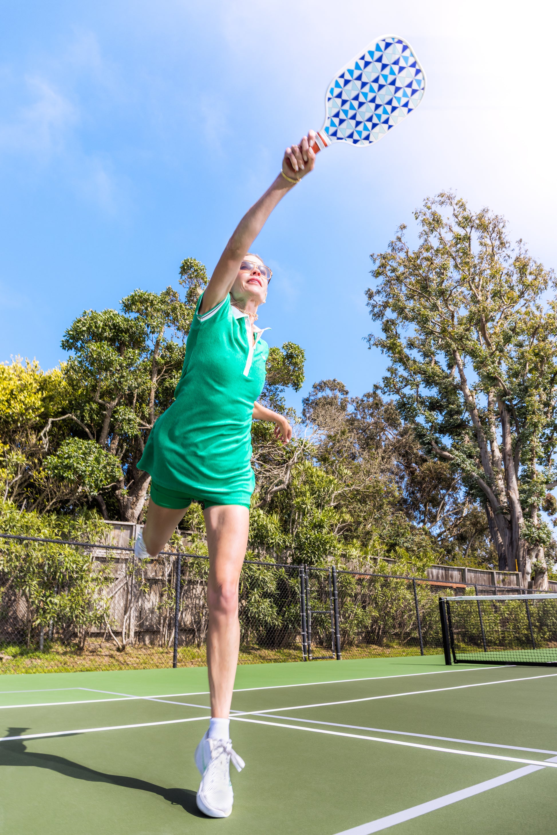Elevate your pickle ball game with The Pickle Me dress and matching boy shorts. Made with stretchy lightweight terry and spandex lycra, this set offers style and comfort on the court. Featuring an adorable pickle ball paddle embroidery on the chest, this dress moves with you for an unbeatable combination of fashion and play.