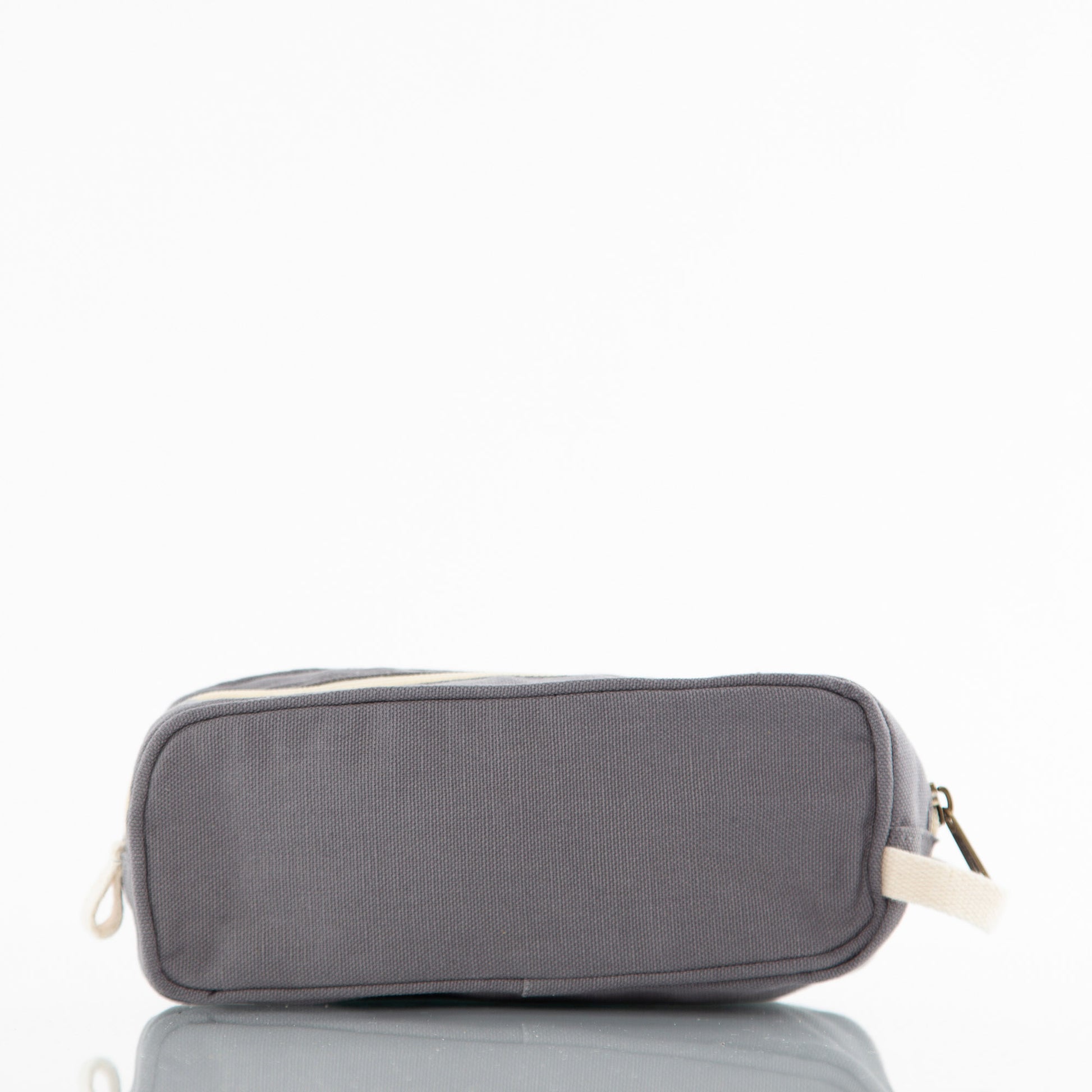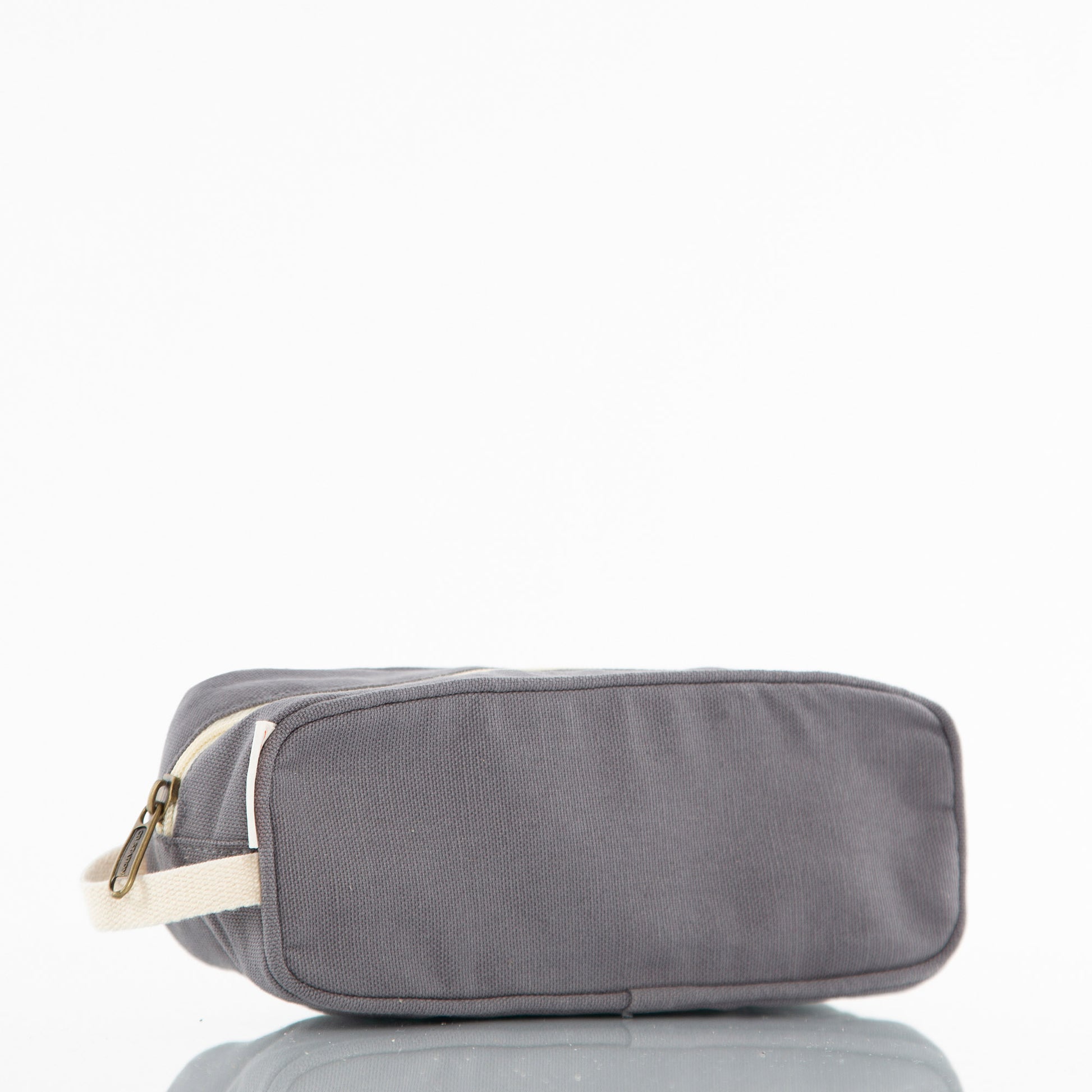 Made with 10 oz cotton canvas, it features a top zip closure, a contrasting webbed side handle for easy carrying, and a wipeable satin interior lining — perfect for holding a toothbrush, toothpaste, flossers, hair accessories, travel-sized toiletries, or small essentials.